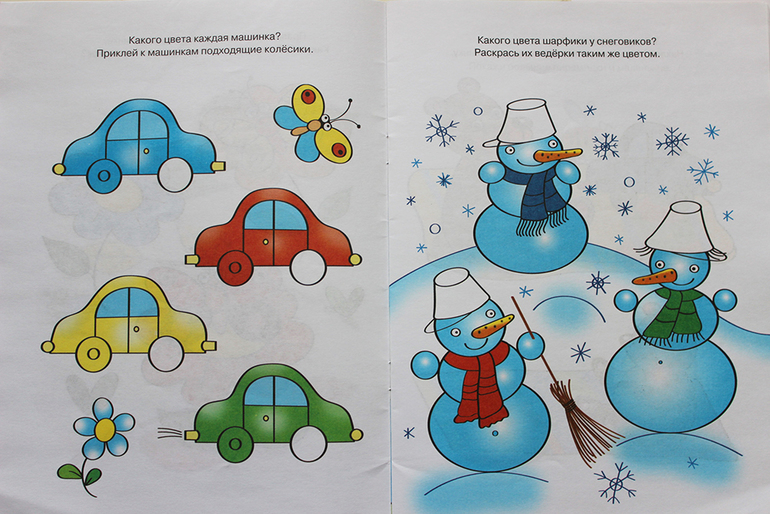 Красочная, интересные задания, ребенку нравится. В первой части, палитра базовых цветов, нужно подобрать картинки-капельки нужного цвета (одого) и наклеить на нужную палитру.