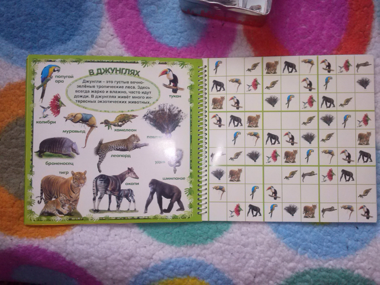 4. Книги все наши посмотрели про животных Джунглей. Хочу похвастаться очень хорошей книгой "Сафари Судоку". Все обитатели мира разделены на типы, места обитания. В судоку играть ещё рано, но Ваня сам себе придумал правила, берет магнитик и ищет соответствующее животное на поле (лото:)).