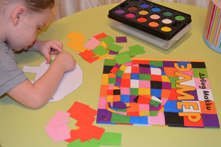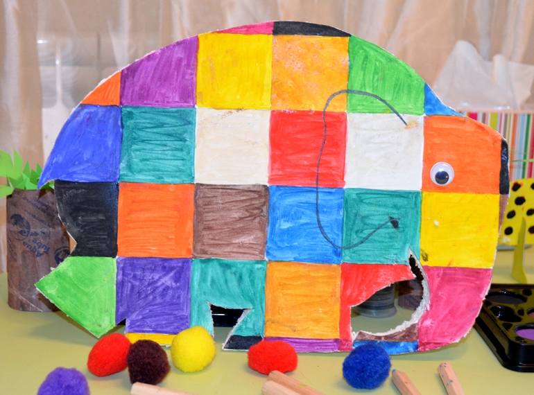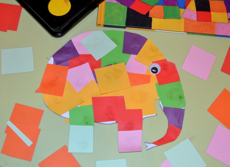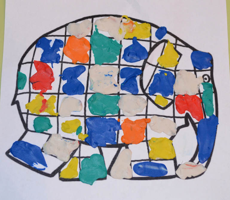 для начала вечером нас встретил Элмер из пенопласта, картона не оказалось в доме, а вот пенопласта полно. на обычном листе нарисовала, раскрасила, приклеила на ПВА, вырезала острым ножом и вуаля, вполне себе приличный слоник