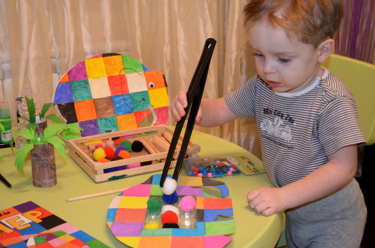 а эту заготовку я сделала заранее. на картоне нарисовала слона, с обратной стороны на горячий клей посадила контейнер из-под перепелиных яиц, с внешней стороны вырезала канцелярским ножом окошечко и раскрасила. такой веселенький сортер получился. раскладывали пинцетом большие и маленькие помпоны, считая и проговаривая цвета