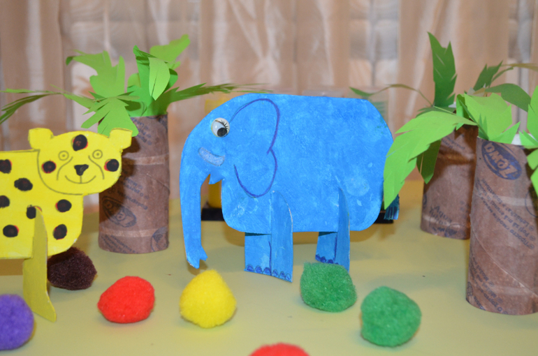 раскрасили шаблоны, ватной палочкой пятна сделали (под моим руководством), пальмы из рулончиков туал бумаги. соберетесь повторить, не берите из-под зевы, в руках расползаются от воды. либо красить надо гуашью, которой у нас, к сожалению не оказалось
