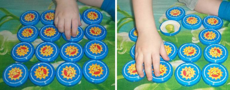 Условия просты: переворачиваем все крышечки "рубашками"-солнышками вверх и ищем парные картинки. Кто нашел 2 одинаковые картинки, забирает их себе. У кого в конце игры больше парных картинок, тот и победил