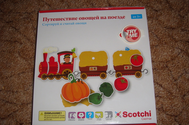 Поезд очень прикольный - можно прицеплять грузовые вагоны к локомотиву, а на вагоны уже лепить овощи, при том на каждом вагоне нарисована подсказка, какие он овощи везет и написано число, сколько их там должно быть. В комплекте локомотив, 6 вагонов, 21 карточка. Очень хорошо развивается мелкая моторика, как утверждает производитель, еще логическое мышление, память ну и внимание, конечно.