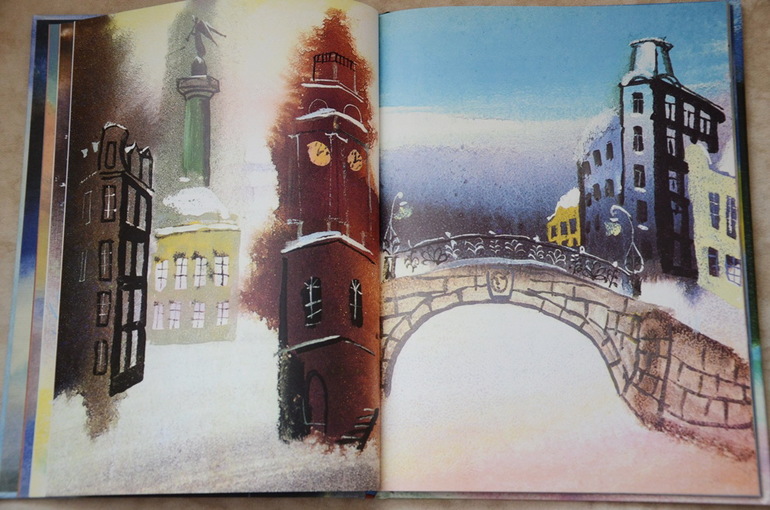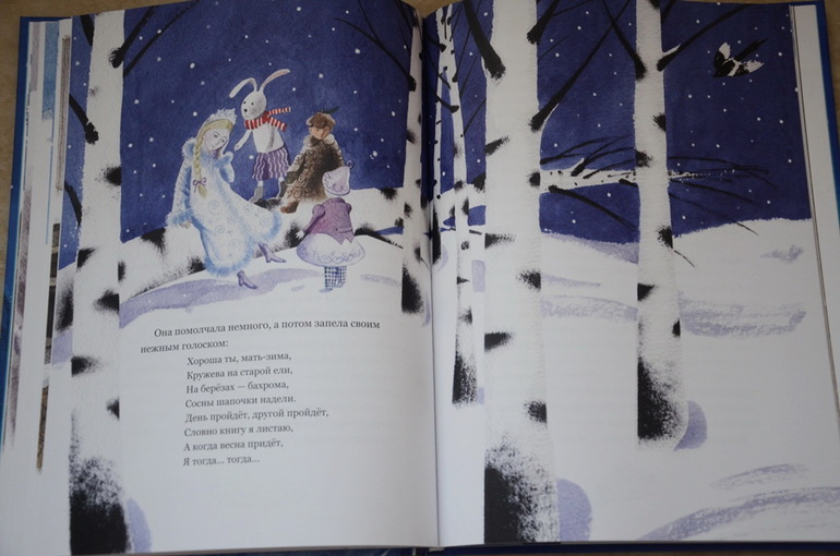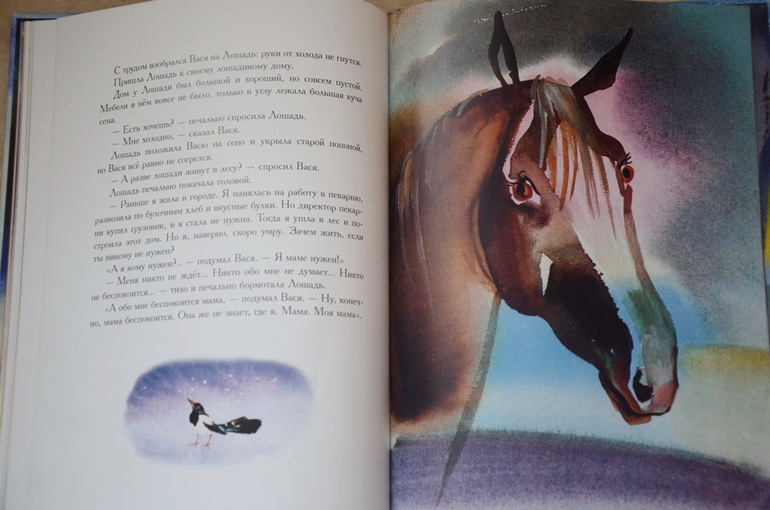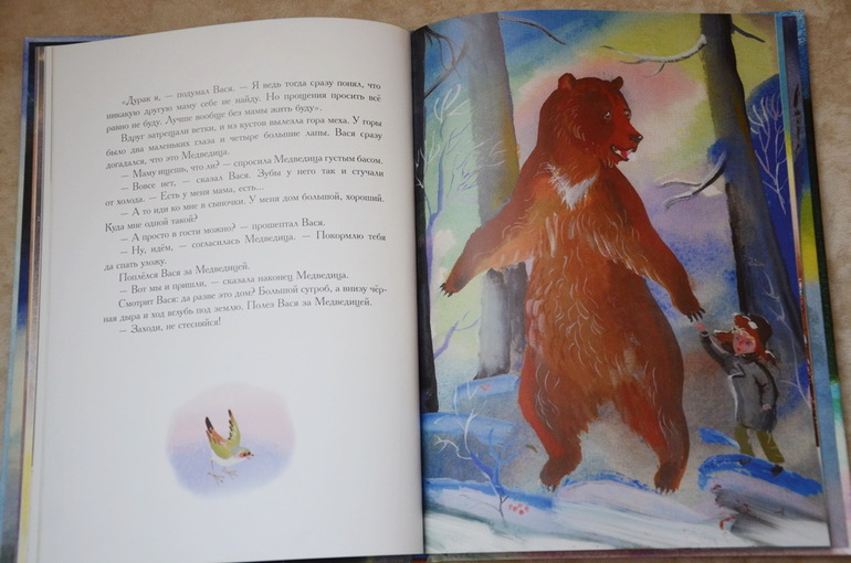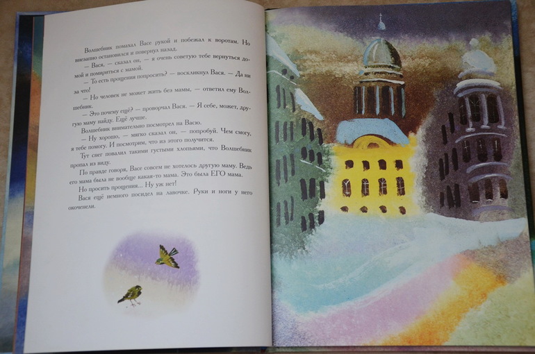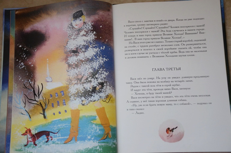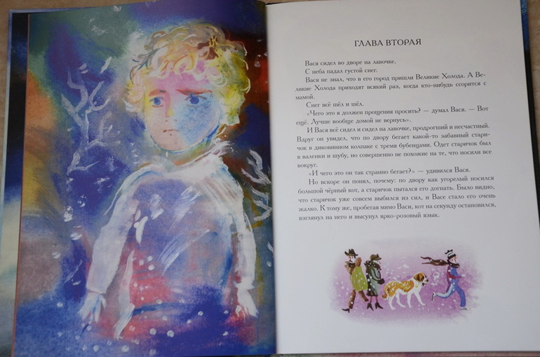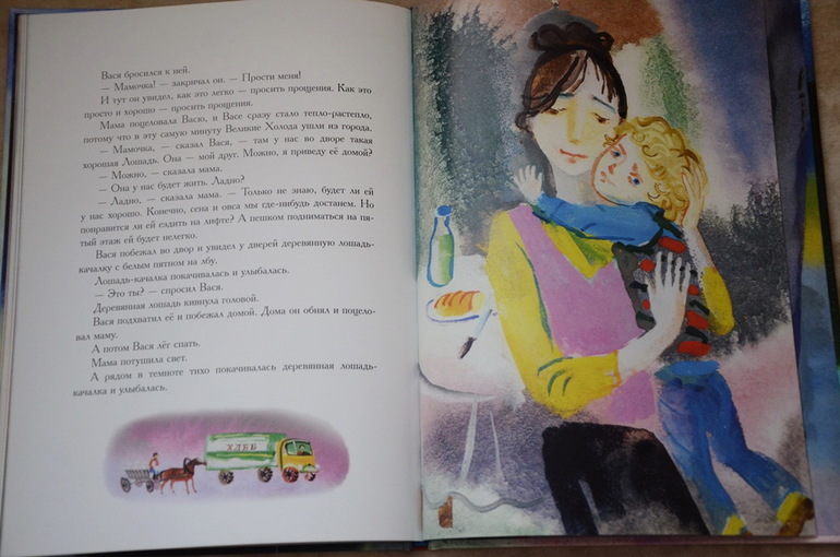 Историю о мальчике Васе, который поссорился из-за мелочи со своей мамой, а потом пошел искать себе другую маму, а в город пришли "великие холода", Настя прослушала от и до с первого раза, внимательно, почти "взахлеб". Потом еще много раз приносила эту книгу читать на ночь, может сама ее подолгу рассматривать и по ходу дела пересказывать сюжет отрывками или что-то спрашивать у меня. История поучительная, в тоже время добрая и трогательная. У меня почему-то каждый раз наворачиваются слезы в конце, когда Вася возвращается домой к маме и понимает, как это просто и здорово - "просить прощения". А Настя всегда меня крепко обнимает.