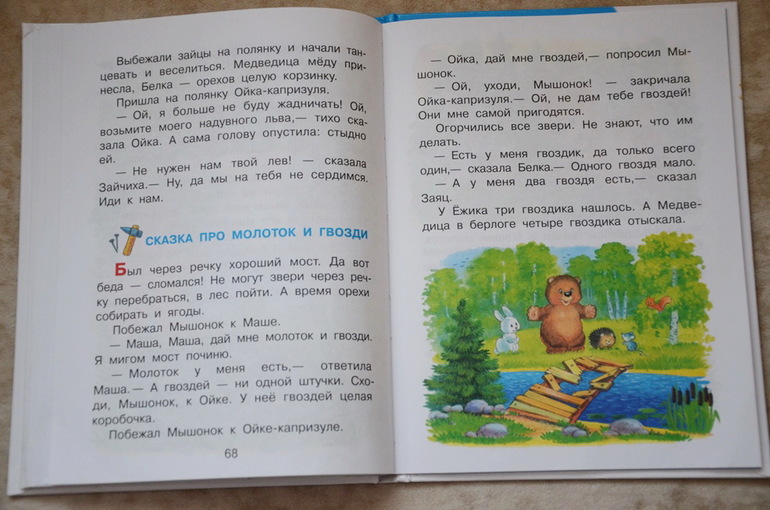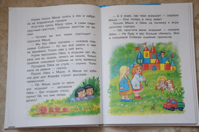Рассказы покорили меня и Настю с первого прочтения. В них простым и в меру поучительным языком автор рассказывает о том, что "такое хорошо и что такое плохо", как важно быть трудолюбивым, добрым, поддерживать друзей, как плохо быть лентяем, плаксой, почему нужно убирать за собой игрушки и т.п. Само издание книги достаточно простое с несколько "кукольными" рисунками, но Насте они очень нравятся. Формат удобный - мой любимый "чуть побольше А5". Вот несколько разворотов.