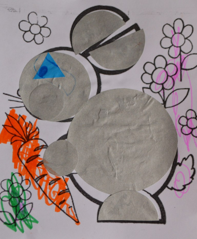 После чего мы удовлетворили в полной мере желание Леруши приклеить всё и ко всему))) А именно сделали аппликацию медведя и зайца их геометрических фигур.