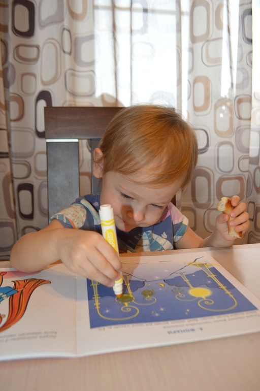 Отмыв руки и стол от клея, и уже жуя баранку Лера немного порисовала в тетради фломастерами. Вот почему-то рисуя в тетрадочке, дочка собирается и старается как можно аккуратнее... А в раскраске можно и каляки-маляки)