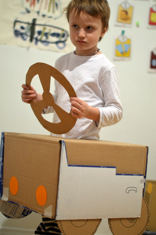 Честно скажу, сначала ребенок мучился в ожидании и предвкушении, а потом страдал от непонимания, что с этим делать? Для приличия пробежался по коридору и обратно пару раз, и вежливо снял с себя эту творческую муку!(зато теперь,в ближайшее время, вряд и он попросит меня сделать ему машину, чтобы открывался капот, багажник, и на крыше была мигалка...понял, что маму может занести)