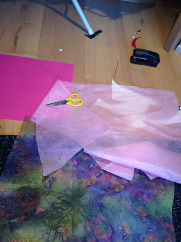 Нам понадобилось : цветная бумага, клей, степлер, двухсторонний скотч, ножницы, припрятаная бумага в которую заворачивают букеты ( была розовая и с бабочками) .