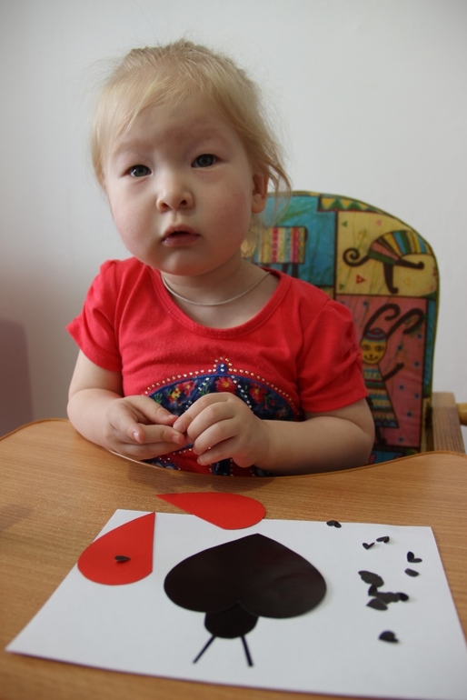 Мажет и прикладывает я немного помогаю, но немного потому что девушка самостоятельная, надо все самой. Птичка была готова, взялись за божию коровку. После книги "Сюзетта ищет маму" Марианна обожает божиих коровок. Также как и с птичкой сначала просто разложили.