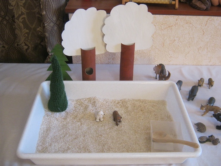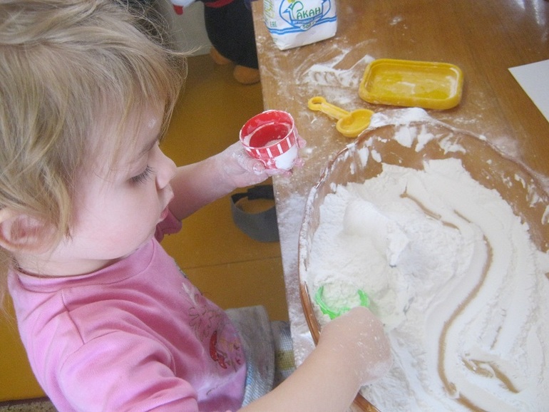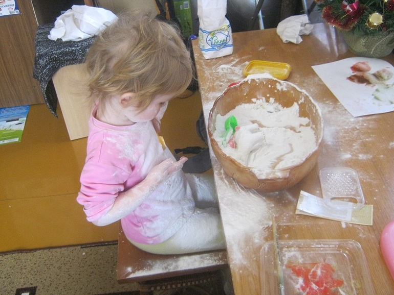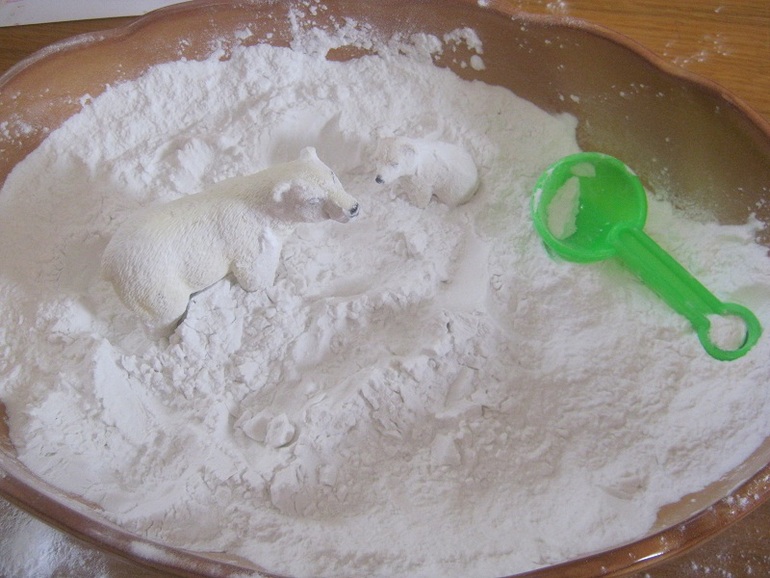 Не ожидала я такого эффекта, около часа Поля сидела и игралась. Очень ей понравился материал, она измазала руки, всю одежду и говорила, что это она моется. Я уже не мешала ей и наблюдала, как она то засыпает, то откапывает медведя, то очищает его кисточкой, то с упоением насыпает крахмал в баночку) Пришлось мне потрудиться, чтобы убрать «накрахмаленное» место, вещи в стирку, ребенка отмыть, пол помыть, ковер отчищала щеткой! На будущее мне наука, подготовить место заранее, но кто ж знал, что так ей понравится идея.