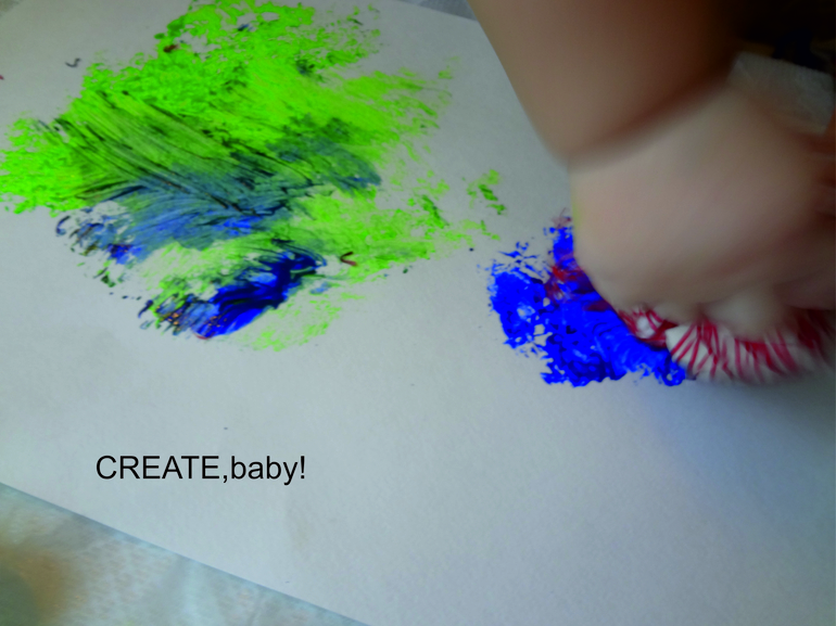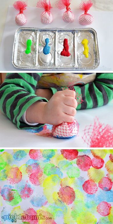 2. Дальше все просто, выдаем ребенку кулечки, краски и успевай подкладывать новый лист бумаги. Мы штамповали и стучали по ним (что особенно понравилось).