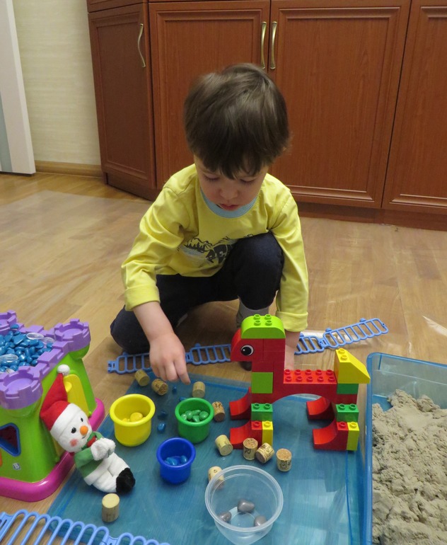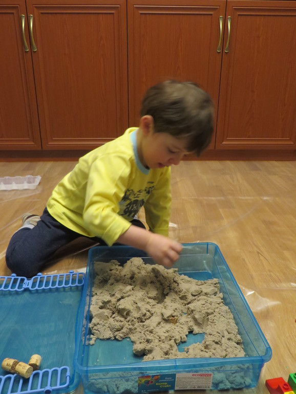 А Кубарик начал желуди по одному выкатывать. Лёня на ура воспринял идею закапывать желуди-пробки в кинетический песок. Правда хотел взять все скопом, но потом согласился, что по одному прятать удобнее. Брал и повторял: "Дин, дин". Понятия точно усвоены!