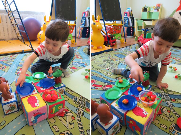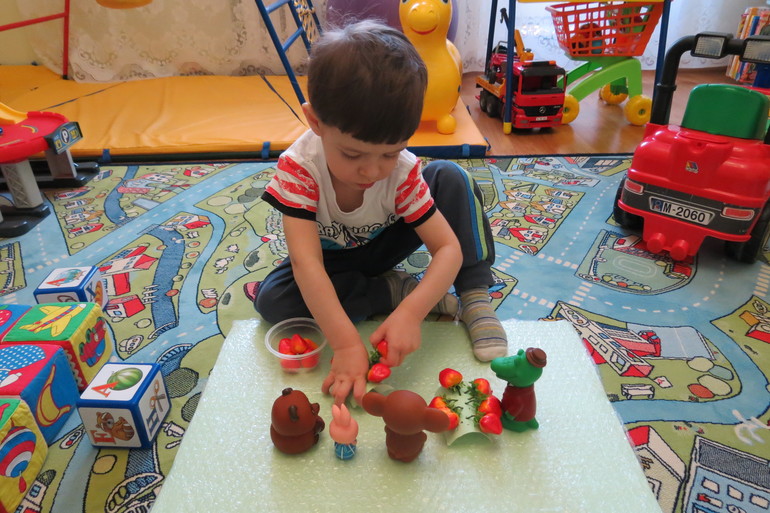 Лёня расставил всем куклам по одной тарелке и разложил по одной ягоде (вспомнив, что сначала клубнику нужно помыть!).