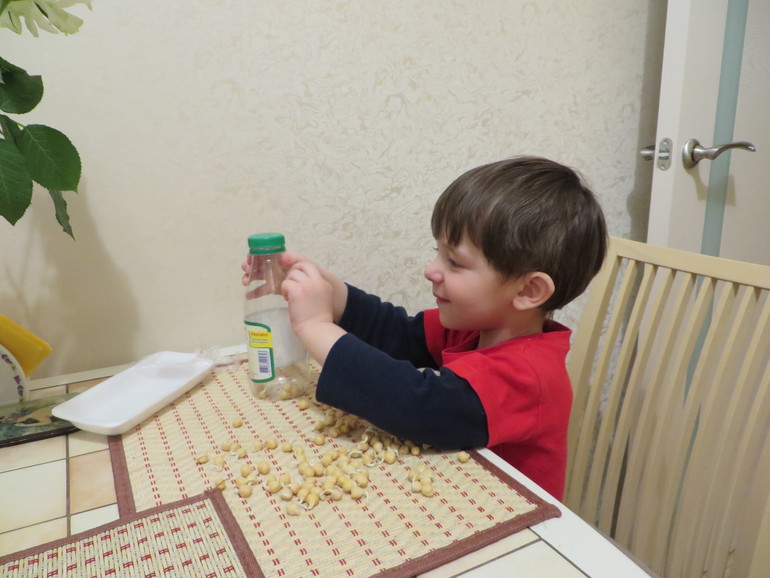 Узкие прорези. Гороха-нут в коробке было много. Потом его стало много на столе, а в коробке не осталось ни одного. Мы с Лёней решили, что папа обрадуется, если мы сложим нут с бутылочку (через крошечную прорезь). Только засовываем по одному, кучей, увы, не получается.
