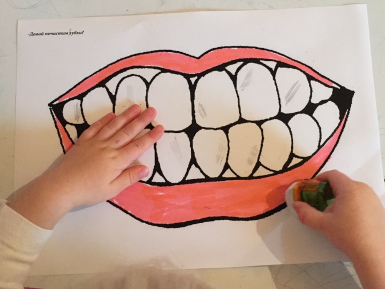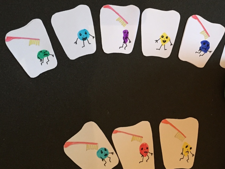 Прогоняли микробов с зубов.Я сделала два комплекта - на одном микробы улыбаются, на другом убегают от щетки. Подбирать надо было по цветам.