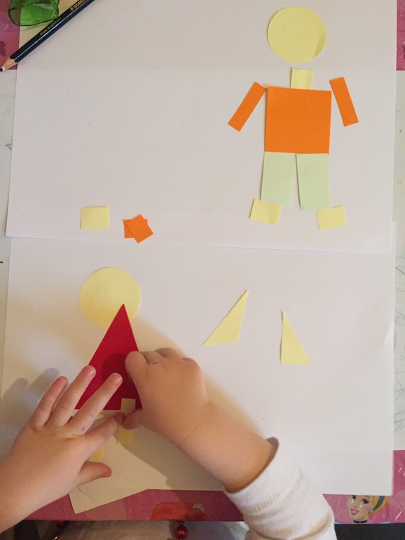 И собрали человечка из геометрических фигур. Я подготовила мальчика и девочку, но Настене быстро надоело, наклеила только девчонку.