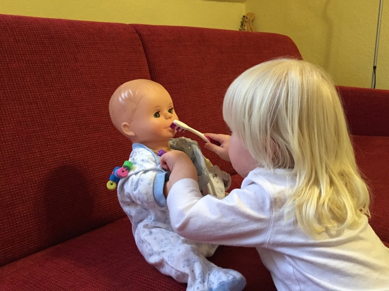 Потом уже стоматолог Настя чистила и лечила зубы всем куклам и мягким игрушкам, кто попадался ей на пути. Ассистент мама отправилась в это время ужин готовить (конечно, только из полезных для зубов продуктов), поэтому фото нет.