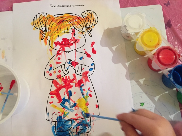 Еще одну девочку одевали с помощью красок ватных палочек. Красное вокруг рта - это помада, конечно! (Шаблон с сайта grow-clever.com