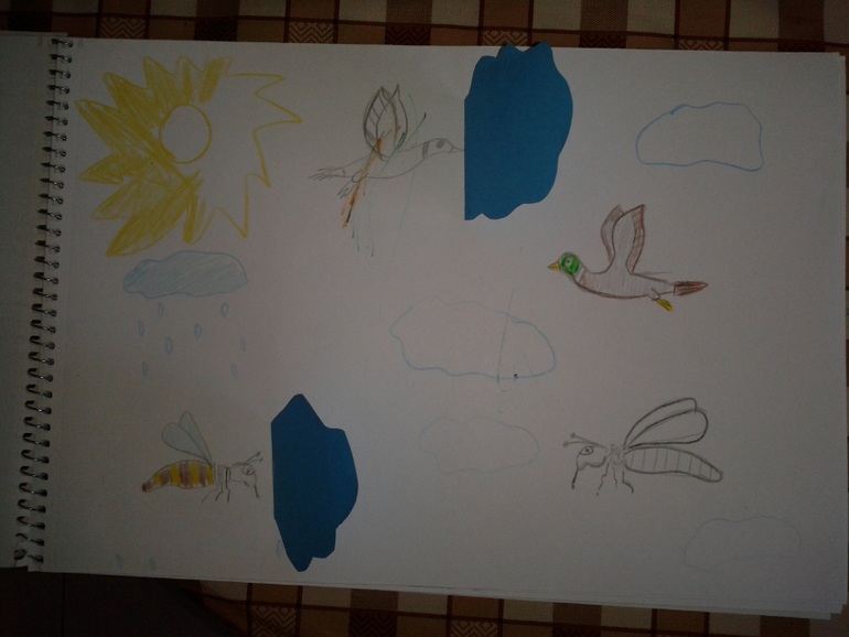 Взяла альбом для черчения (в нем бумага плотная и более приятная), нарисовала как могла. Вырезала облачка из икеевской бумаги и приклеила обычным клеем-карандашом. Вырубки (трафареты) тоже можно сделать, но я пока для пробы сделала несколько страничек с раскрасками. Дочке понравилось.