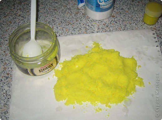 Как я красила соль. Соль нужна самая мелкая (я такую не нашла в магазине, купила среднего помола и измельчила в порошок в блендере), насыпаем ее в любую ненужную емкость и добавляем немного гуаши (я делала 5 цветов), хорошо перемешиваем , рассыпаем на картоне и сушим (можно в духовке или микроволновке, у меня сушила ночь на подоконнике). Соль затвердевает после высыхания, поэтому ее нужно высыпать в пакет и раскатать скалкой. Ну а дальше пересыпаем в баночке и творим)))