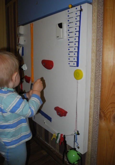 Начали делать таую игровую развивающую панель, идей было много, начали так активно, а потом успокоились, ребенку и это нравится, первые две недели жил у нее. Просто фанат кнопок и выключателей, невозможно спокойно в туалет, извините, сходить )) Эта панель хотя бы немного отвлекает ))