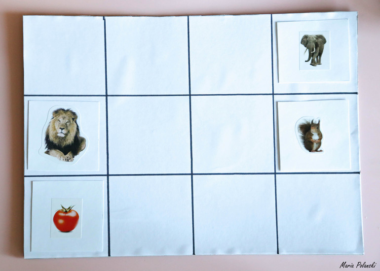 Вариант по-сложнее и более соответствующий методике, когда раскладываются карточки в хаотичном порядке на разлинованном клетчатом поле. Тут желательно иметь два одинаковых поля и два одинаковых набора карточек. Первые раз вы сами выкладываете карточки на поле, показываете и называете их ребенку, а потом накрываете свое поле вторым экземпляром и по одной даете ребенку изображения, которые нужно расположить по памяти в тех же клетках поля.