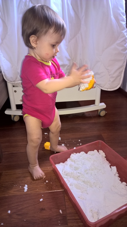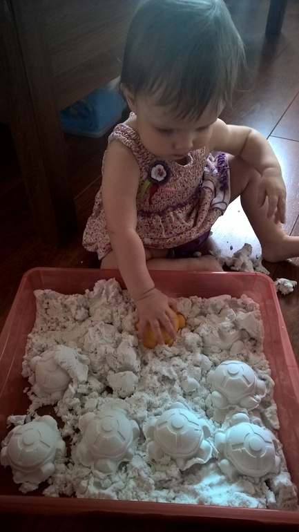 любит очень живой песок, сама его находит и открывает. Путается делать куличики, но пока все вываливается и летит во все стороны