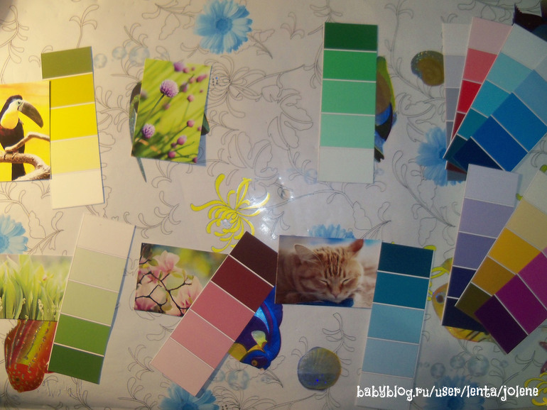 В продолжение развития цветовосприятия предложила весенние палитры. Вот тут прокол случился. Картинки были, а оттенки потерялись. Достали другие карточки с оттенками, искали преобладающие цвета, но недолго.