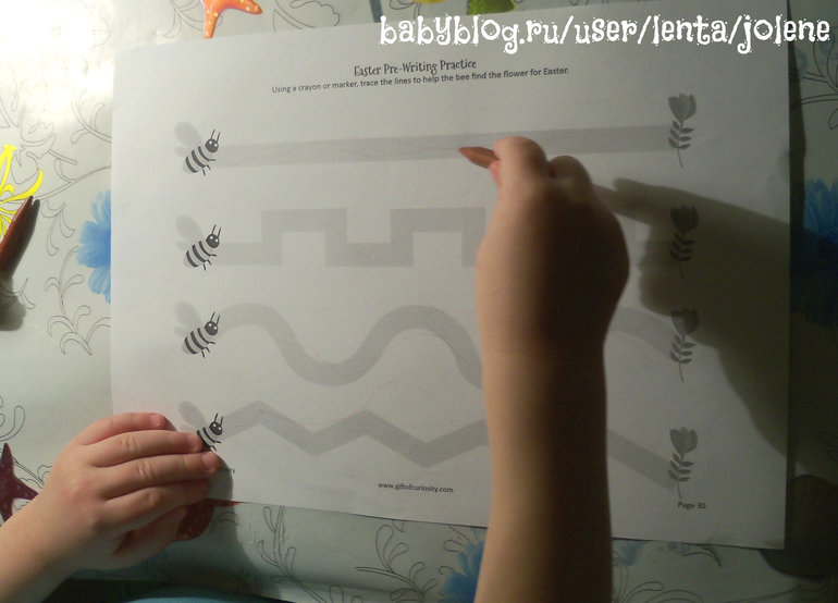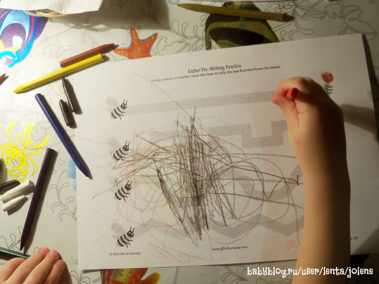 Сделали несколько заданий на подготовку руки к письму. Мир даже старался вести по линиям, но карандаш при этом держать правильно принципиально не хотел.