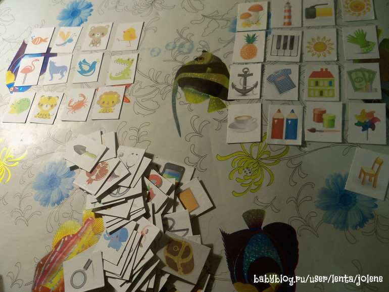 Следующим пунктом была сетка памяти. Но Мир по-прежнему саботирует эти карточки для конкретно этой игры. Ему сразу надо много, а лучше все. Поэтому мы их сортировали по принципу "живое-неживое".