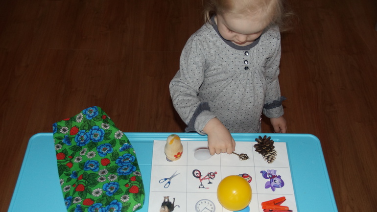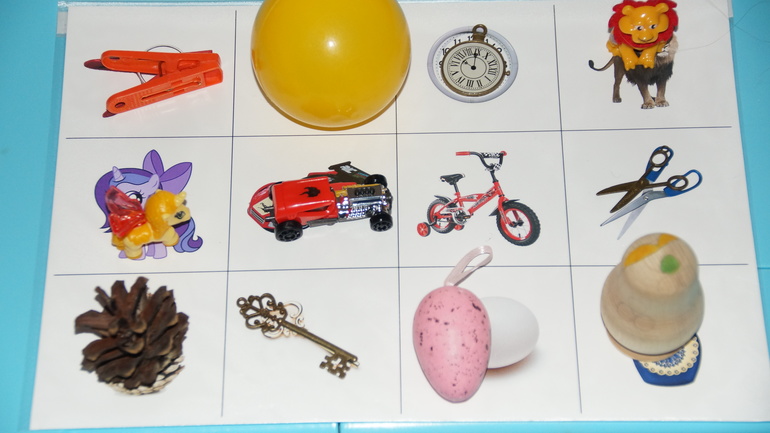 Еще одна разновидность тактильного лото - "кот в мешке". Эта игра Ане тоже очень полюбилась. Я собрала девять различных по фактуре и форме мелких игрушек: из пенопласта, деревянные, пластиковые, металлические. Нашла в интернете картинки, чтобы сделать игровое поле. Картинки не в точности повторяют реальные предметы, но, считаю, в этом ничего критичного нет. Для лото подойдут и игрушки из "киндера", правда, они все пластмассовые, так что тут только разнообразие по формам получится.