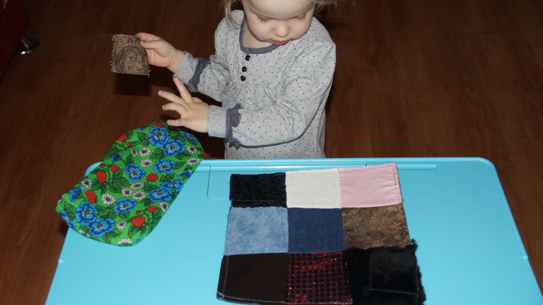 Изучаем свойства тканей, учимся, не глядя, на ощупь отличать один материал от другого. Здесь же тренировка цветовосприятия. В нашем наборе девять тканей: мех с длинным ворсом и коротким, кожа, вельвет, джинса, шерсть, фланель, трикотаж, ткань с пайетками.