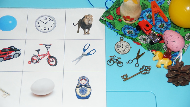 Как играем: прошу Аню найти в мешке, например, велосипед, она ищет, не глядя, кладет на игровое поле. Кстати, вот такие прелестные предметы: часы, велосипед, ножницы - мне посчастливилось купить в одной магазинчике товаров для творчества.