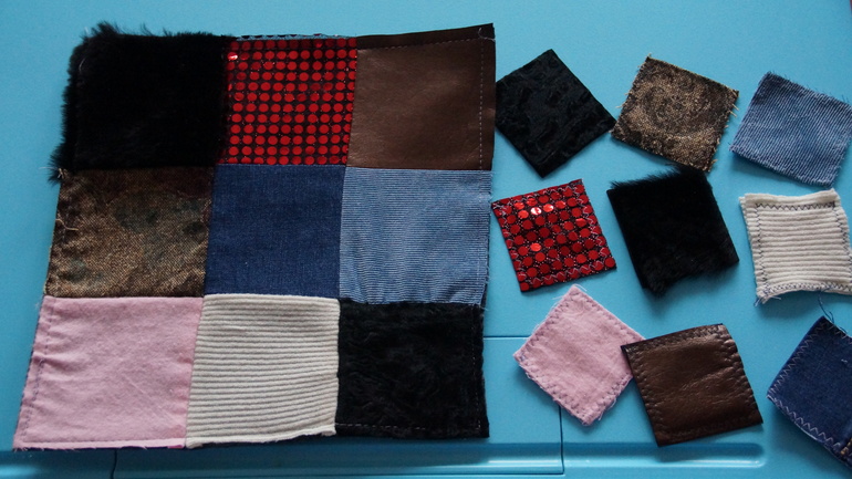 Из образцов мы сшили игровое поле. Отдельно нарезали кусочки, их прячем в мешок. Я загадываю ткань, описываю ее свойства: шершавая, ворсистая, гладкая и тд. Аня пробуем найти ее в мешке. Не подсматривая. Уже получается. Но мы сначала, конечно, ткани трогали, гладили,смотрели в живую.
