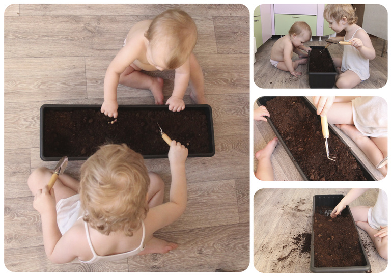 Конечно же, начали с знакомства с материалом. Марго, с некоторой осторожностью (А вдруг укусит?), опускала свои ручки в землю. Ростя сразу же принялся закапывать клубень картошки, а затем построили муравейник. Потом Марго случайно рассыпала землю на пол, Ростя весело подхватил и помог ей закончить начатое)))). Ну как иначе?))) Спустя пол часа, оба поросенка, отмывались в ванной.