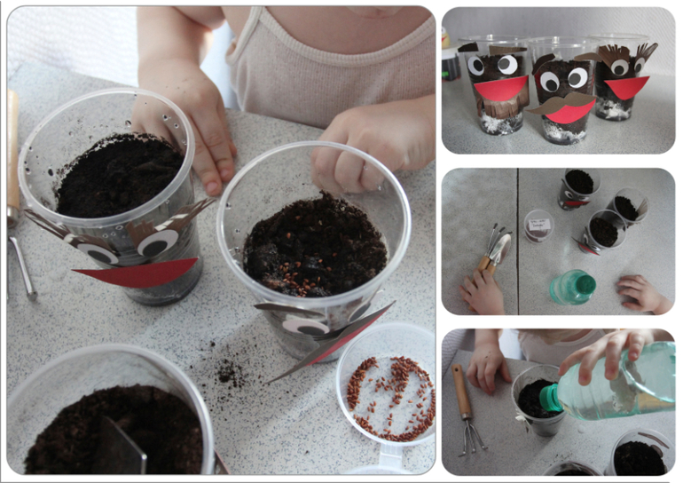 Когда сбили "охотку" копаться в земле, принялись сажать урожай. Я заготовила стаканчики, которые накануне мы с Ростей украсили веселыми рожицами. Приготовили инструменты для посадки, семена и воду. В стаканы сажали кресс-салат. Ростя увлекся сыпать семена и очень аккуратно поливал водой.