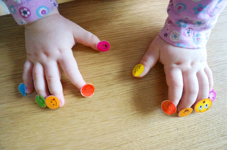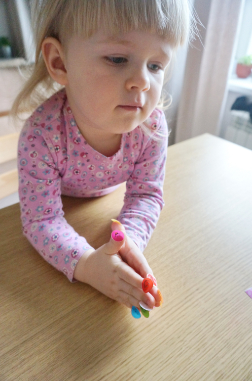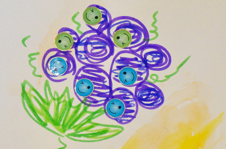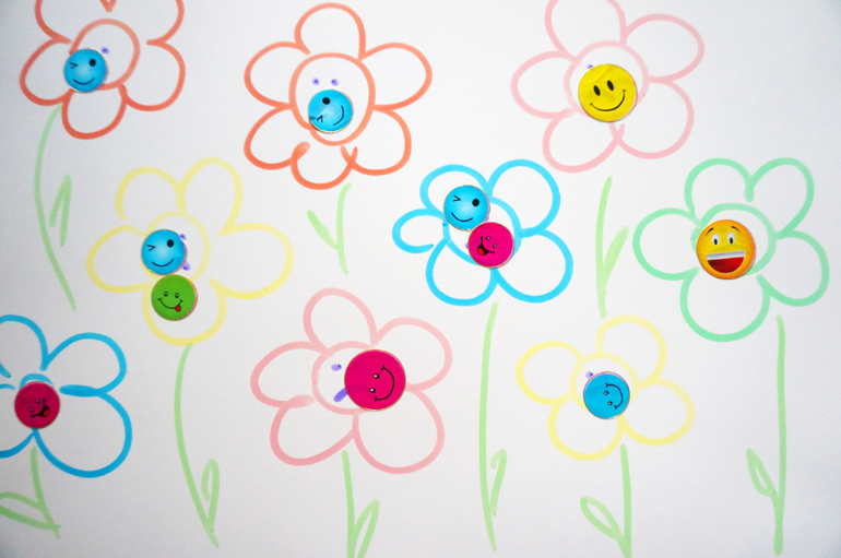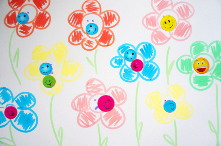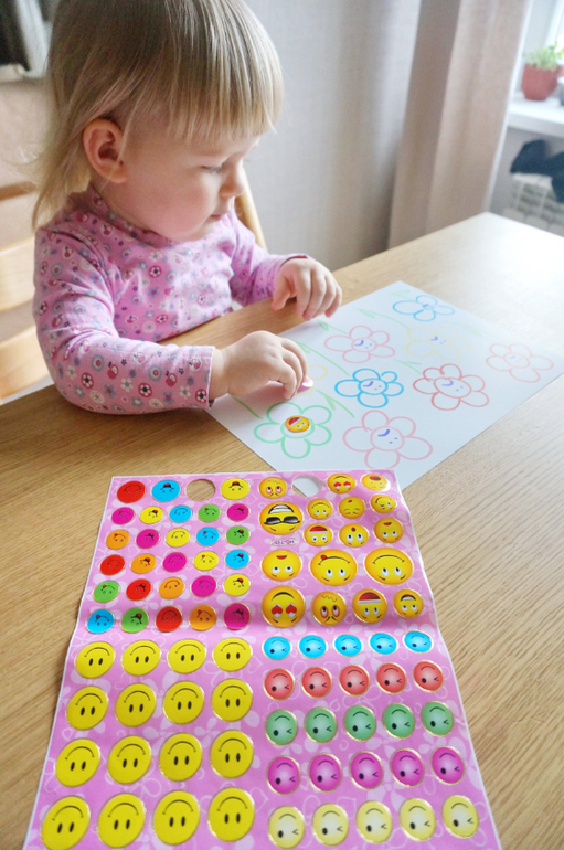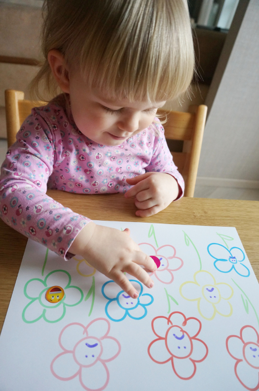 Развивающие игрушки своими рукамиМы часто смотрим английский мультик Charlie and the numbers. Там есть серия про цифру 4, которая нарисовала черно-белые цветы и они были грустными, пока Чарли не придумал их раскрасить и развеселить. Недавно купила лист наклеек с рожицами, и решила, что это хороший вариант озадачить Машу развеселить цветы, которые я заранее нарисовала на листке бумаги фломастерами. Она быстро вовлеклась в процесс и радовалась изменениям на лицо!