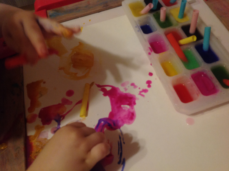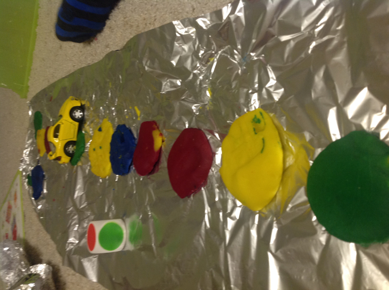 Я, наконец-то, во всех магазинах страны появились пищевые красители и мы принялись варить paly doh))) Устроили игру - бросали кубик и какой цвет выпадет, на такой ставили машинку. Кубик кидали по очереди. Выигрывал тот, чья машинка быстрее окажется на финише. Победила дружба)