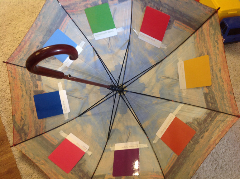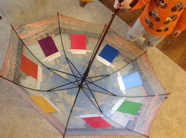 Здесь мы сняли с зонта наши цветовые карточки и раскладывали игрушки по цветам. Было интересно наблюдать за Володей - как он выбирал между оттенками темного и светлого. Иногда, по правде, и я сомневалась, куда же отнести очередную игрушку - последнее слово оставалось за Володей.