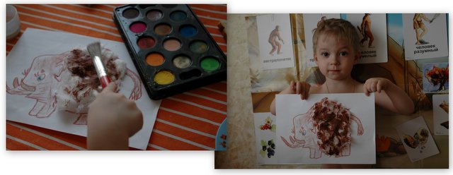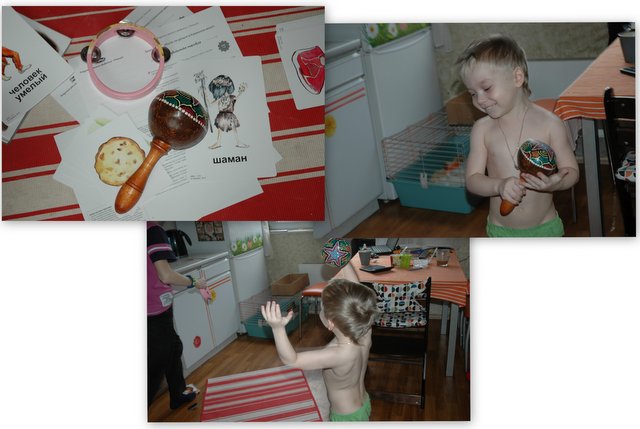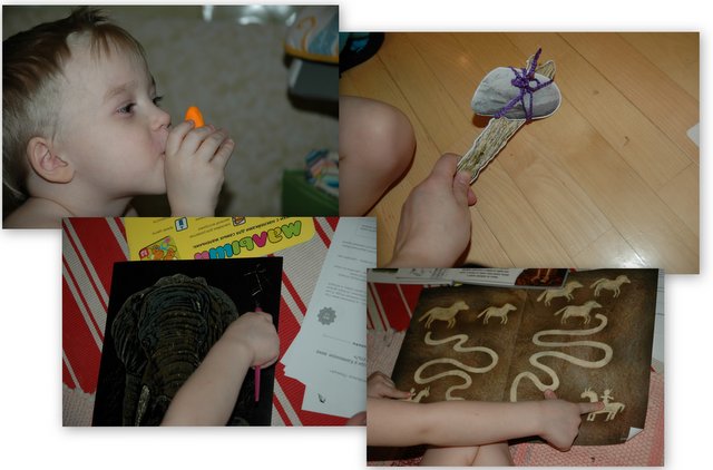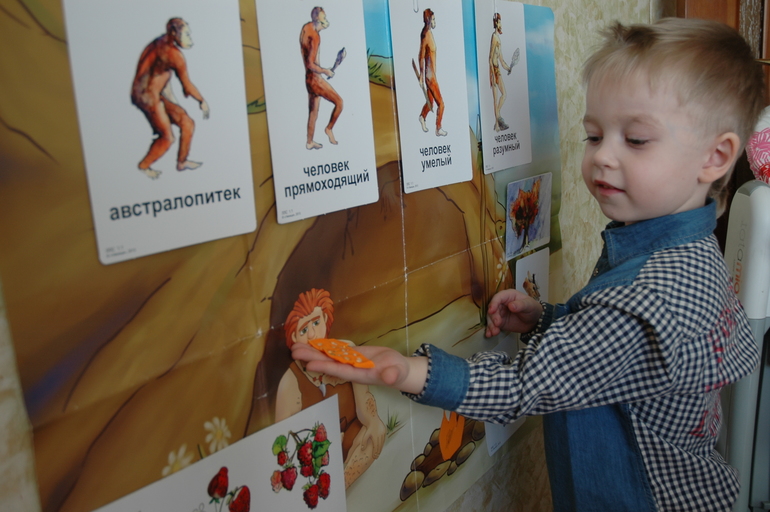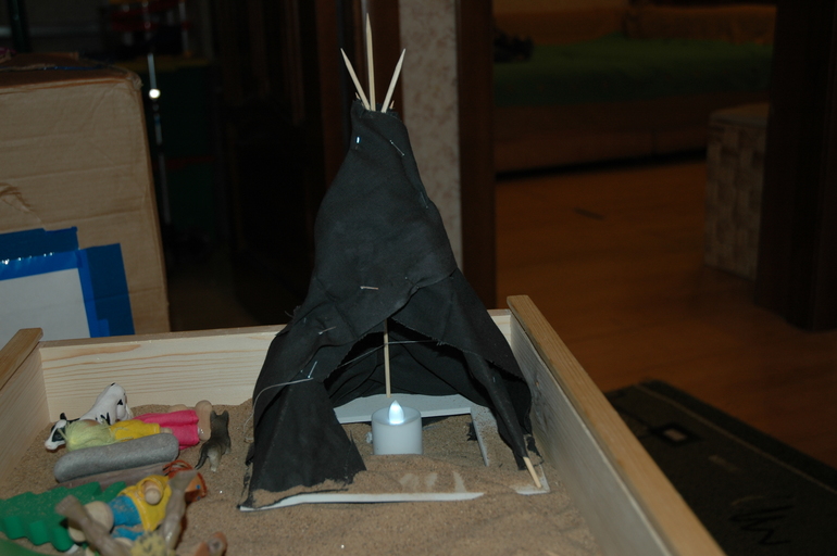 На протяжении всего времени пока мы отыгрывали данную тему наш первобытный человечек жил в песочнице, постепенно они вместе с Матвеем строили жилище, учились добывать огонь, приручали животных, знакомились с представителями других племен и прочее прочее.