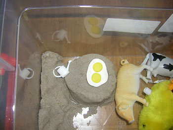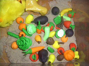 Теперь Вита проигрывает сценки, придумывает всевозможные сюжеты, сажает огород нашими самодельными овощами и фруктами (лепили с мужем из полимерной глины), поливает их игрушечной леечкой, угощает животных едой, налепленной из той же пластики, роет ходы и делает пещеры, "готовит" мороженное - черпает песок круглым совком и раскладывает по тарелкам!.. Всего я даже не запомнила.