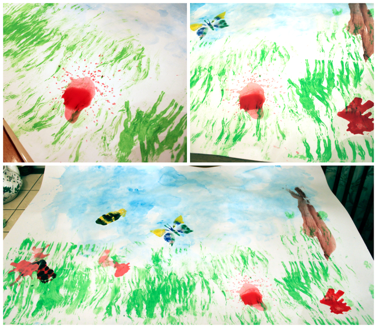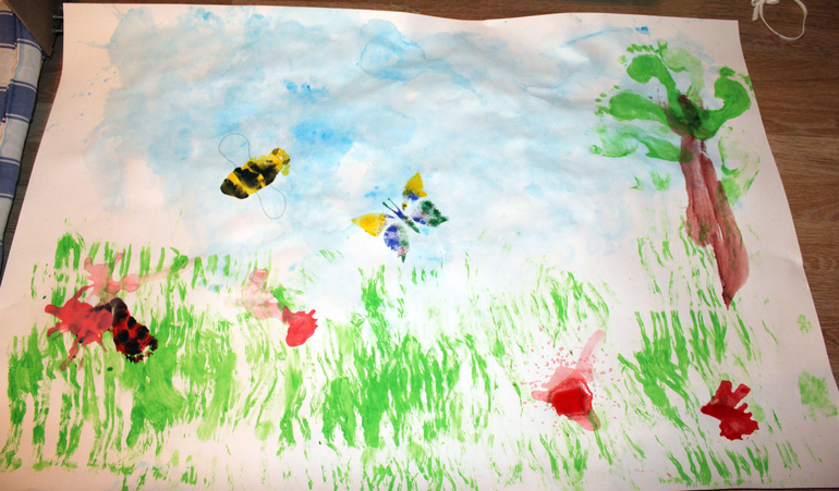 Перед тем, как продумывать способы рисования без рук, нужно было определиться с основной концепцией. Целиковой картинки не возникало, обратились к Вареньке (надо было сразу её спросить, рисует-то она)), она сказала, что хочет рисовать небо, травку... Спасибо крошке, дальше мне оставалось только продумать способы рисования и кое-какие детали и предложить попробовать рисовать необычным способом Варе.