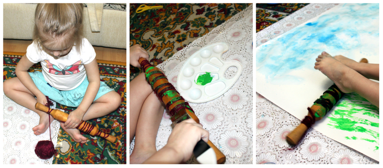 Трава - обматываем скалку нитью, красим, Варя катает ногами: