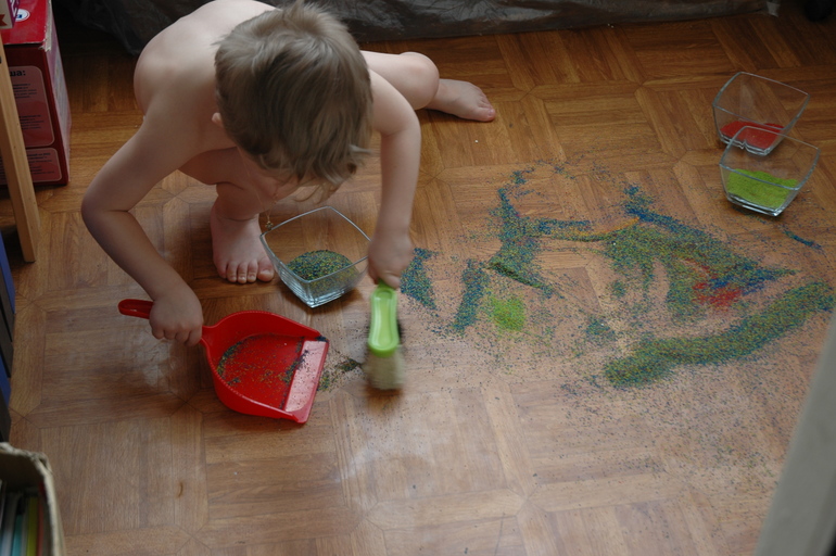 Но надо отметить, что это ни так просто, свободно рисовать песком, смахивать на стол или на пол и опять рисовать. И взрослым сложно и детям, а слабонервным мамам-перфекционисткам (как я) вообще опасно...))))))) мой ребенок раз 5 спросил точно? Можно? прям на пол? прям можно сыпать? ух ты!!!! Клево!!! и процесс пошел.