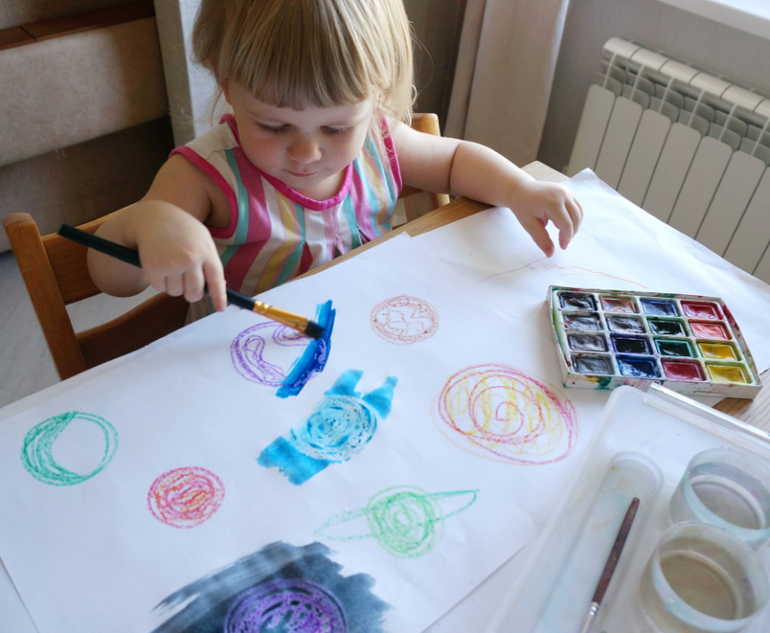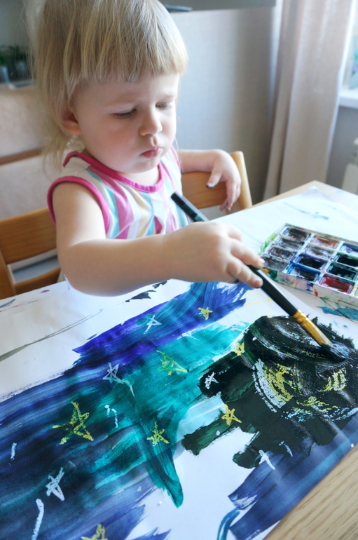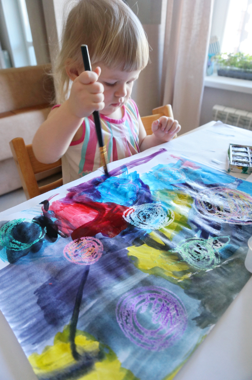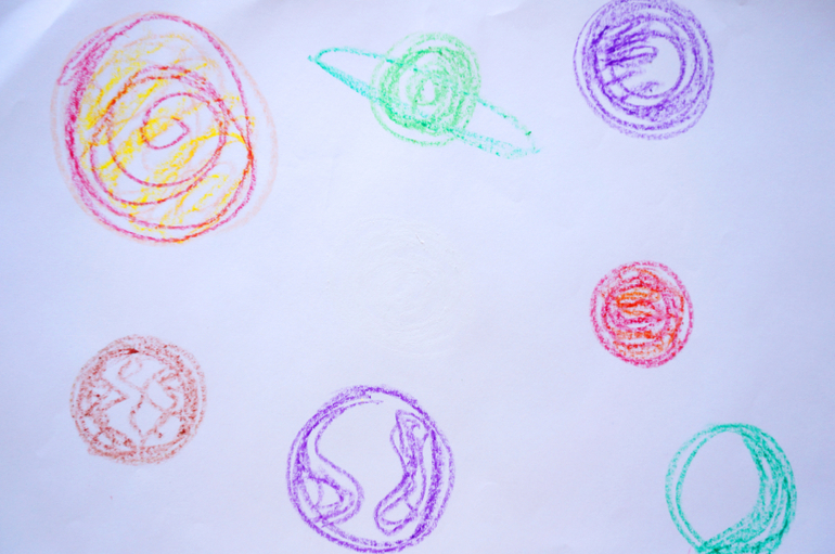 Изучаем окружающий мир (тематические занятия и циклы занятий)Нас немножко захлестнула тема космоса, знакомимся сейчас с планетами. Решили нарисовать свою галактику с помощью акварели и восковых мелков. Я быстро начертила мелками планеты, а Маша красила космический фон. Планеты проявлялись и мы их обсуждали, а потом решили создать небо с Млечным путем (знаете ли вы, что по-английски, это milky way)?