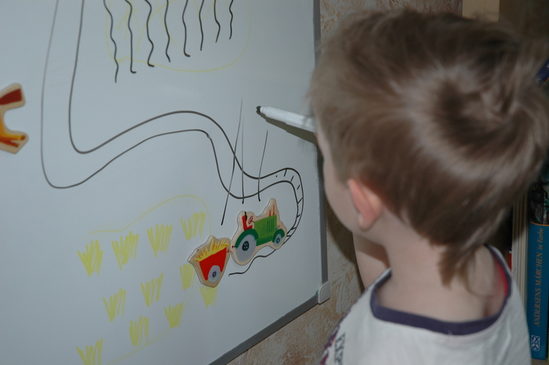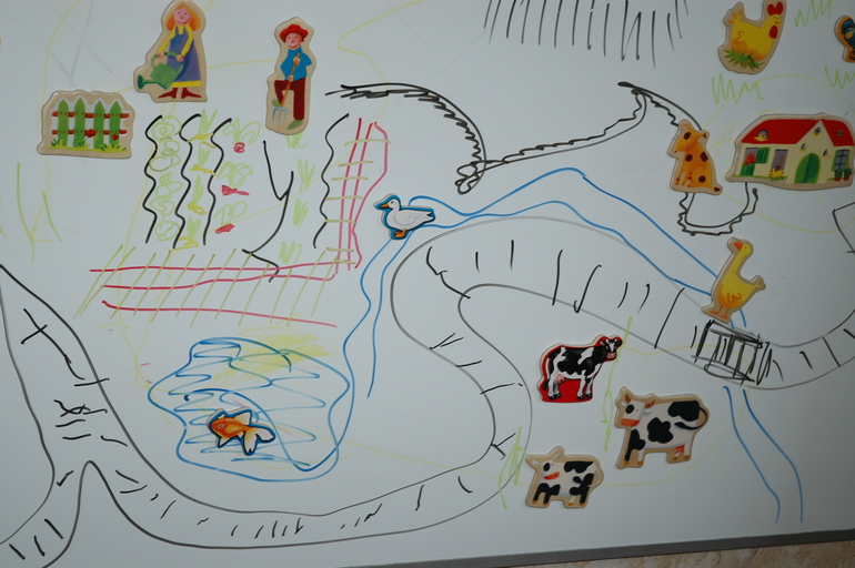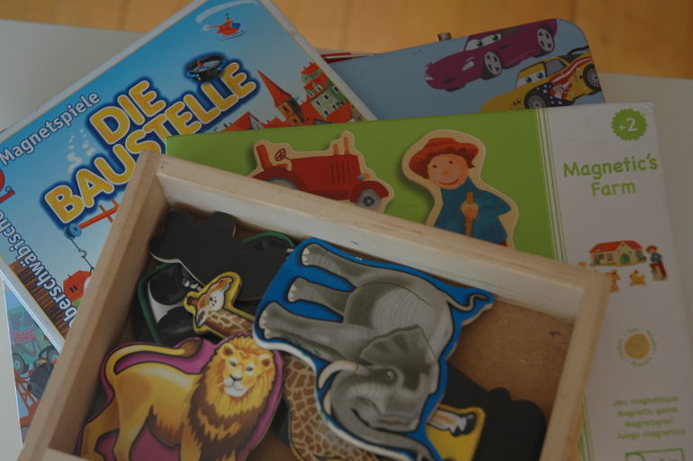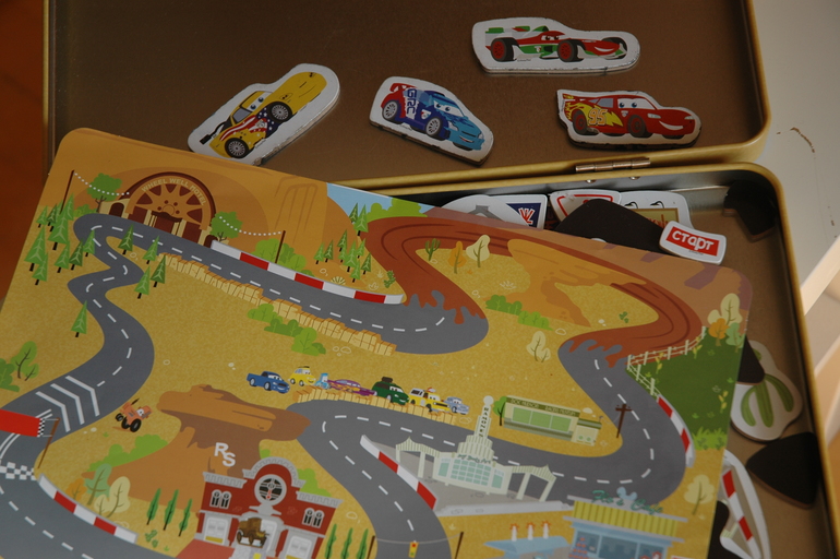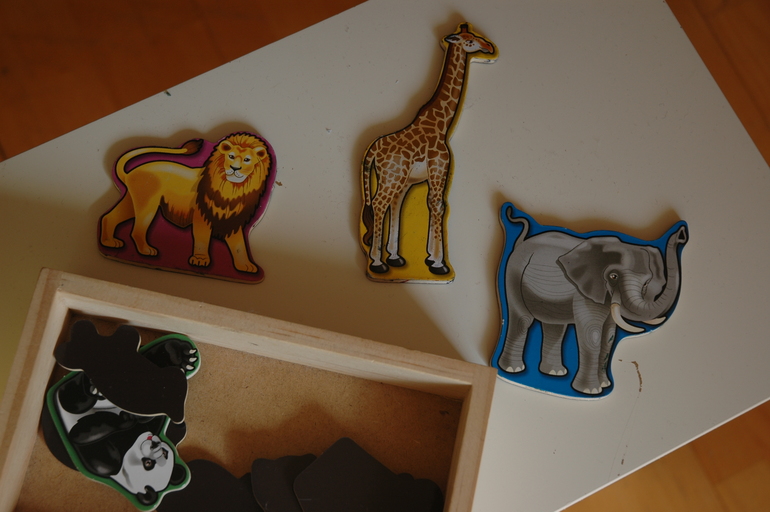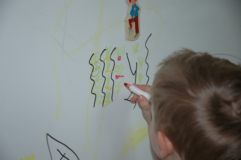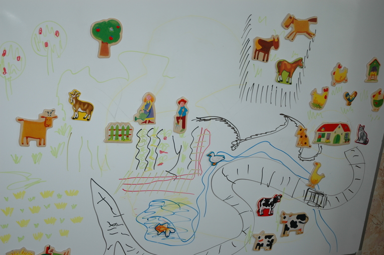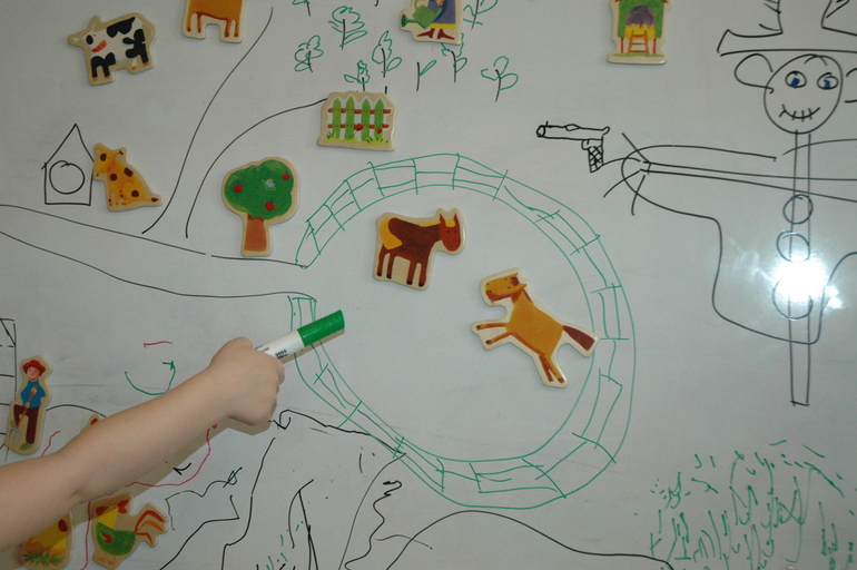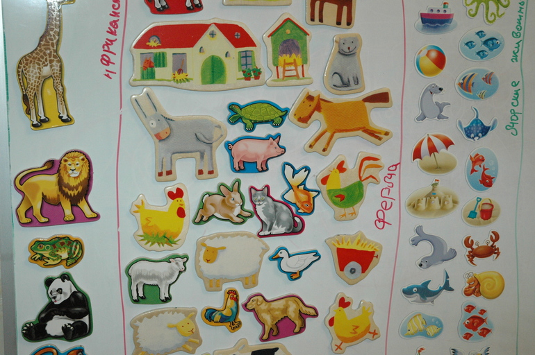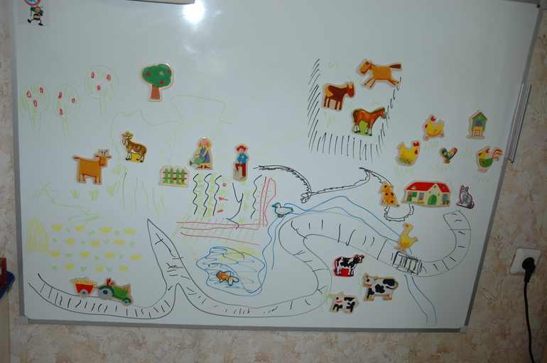 У нас есть несколько наборов магнитов, большая маркерная доска и водные фломастеры.