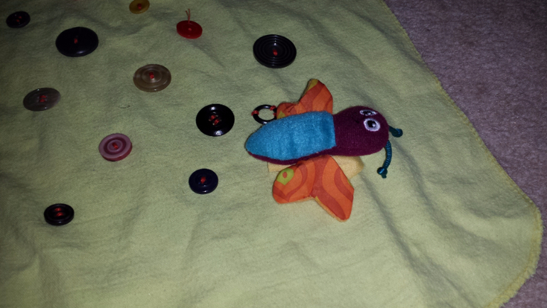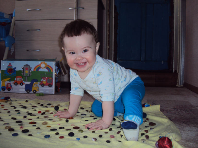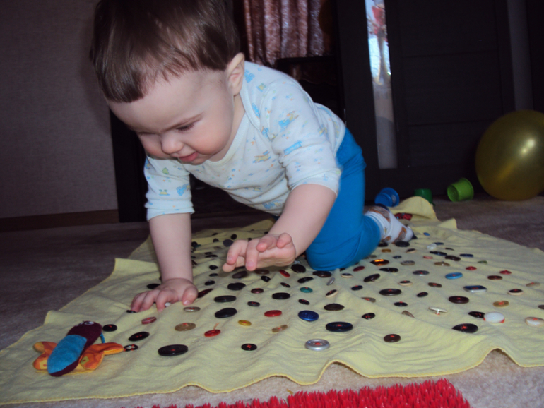Еще по углам приделала на липучках и к самим пуговицам мягкие, шуршащие игрушки от браслетиков и носочков, из которых мы давно выросли. Но на них Ярослав мало обращает внимания. Его страсть - пуговицы))) Коврик я сделала, когда ему было 1,1 года. Благодаря коврику, он стал показывать на пуговицы и требовать словом Га, чтобы я назвала цвет, размер и материал пуговицы (например, черная большая кожаная пуговица). Если я молчу, то его интонация усиливается))) 2 месяца этот коврик был нашим хитом, никаких других игрушек ему не надо было, сам приносил его, просил расстелить. Сейчас интерес под утих, несет только, если попадется на глаза.