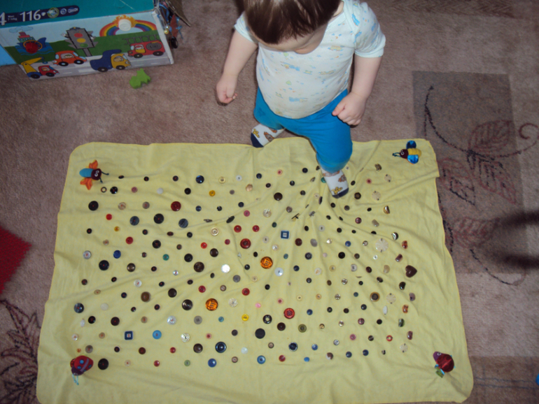 Развивающие игрушки своими рукамиМоя бабушка увлекалась раньше шитьем. И я с детства помню, что у нее была волшебная коробочка с кучей всяких разных пуговиц. И вот я выросла, появился сынок. Захотелось сделать что-то для него своими руками. Насмотревшись на мастериц, вспомнила о чудо-коробочке, которая дожила до сегодняшнего дня. В ход также пошла фланелевая пеленка. Так получился наш массажный коврик.