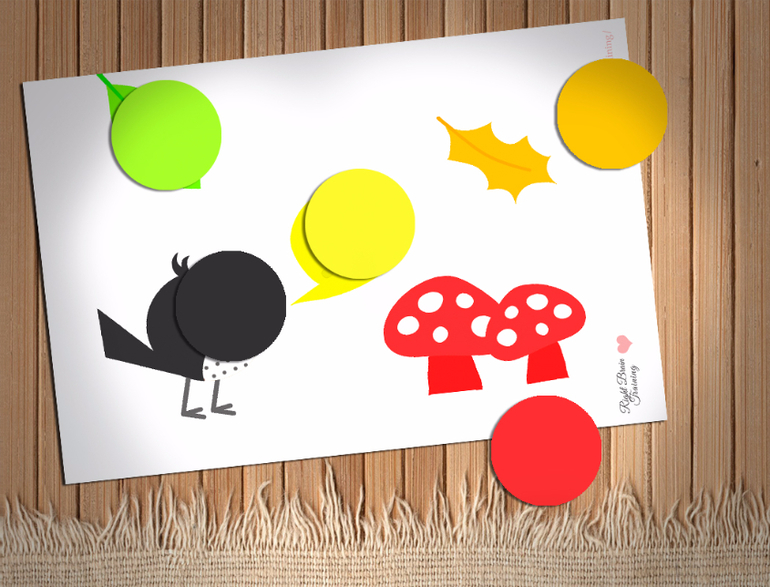Малышам предложите один вид геометрических фигур (например, круги разных цветов) и картинку, пусть попробует на каждый объект положить кружок соответствующего цвета.